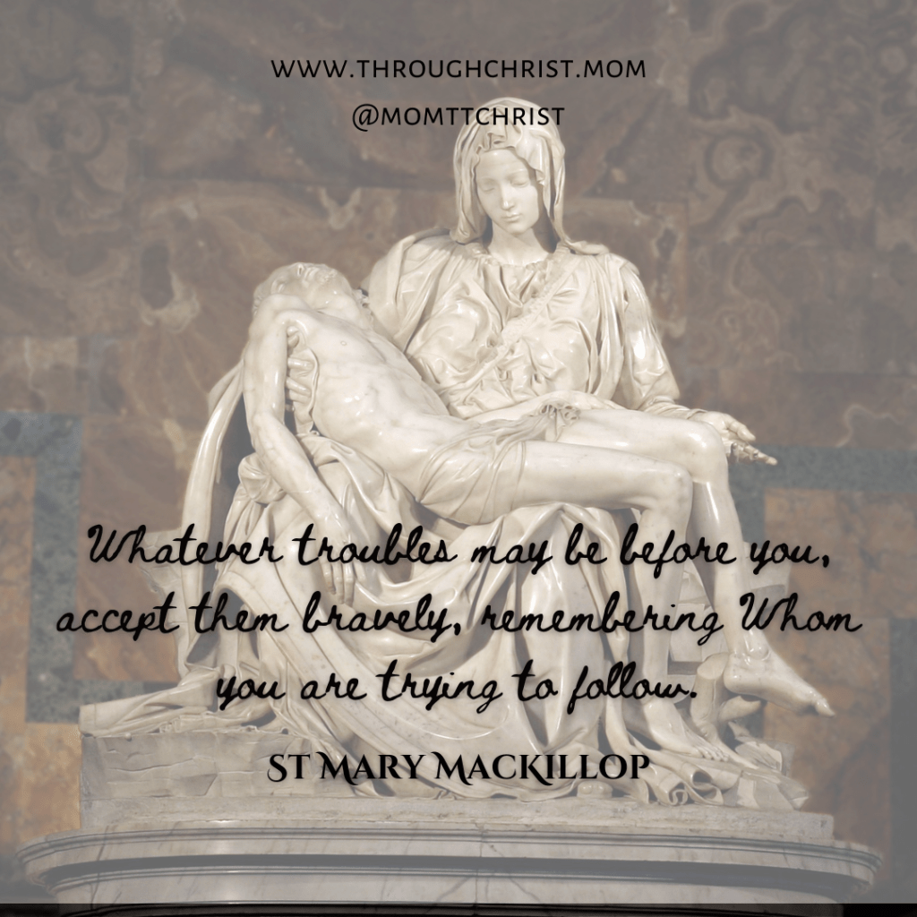 As mothers, we suffer with our children, and do what we can to help them bear their pain with grace. We can look to Mary as am example, as she carried her motherly pain and suffering with great grace. We know that the causes for her sorrow brought glory to God and salvation to the world. We can also lift up our sorrows, motherly and otherwise, and use our kingdom priesthood that was conferred to us at baptism, joining them with the sacrifice of our Lord at Holy Mass. In this way, our sorrow and suffering can also be given to God and used for His glory and the salvation of souls.