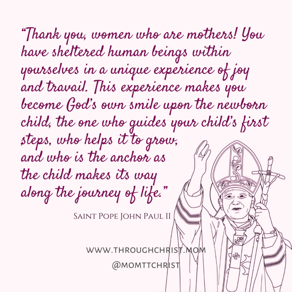 Each of us, male or female, is called to bring God to others, in everything we do. We so often refer to God with the masculine pronouns, but there are both masculine and feminine qualities in God. It is important to remember that outside of the person of Jesus Christ, God is neither male nor female. St Pope John Paul II’s quote really brings to mind the maternal aspects of God’s love for us. His quote compels me to consider how I am bringing these qualities to my children and others around me.